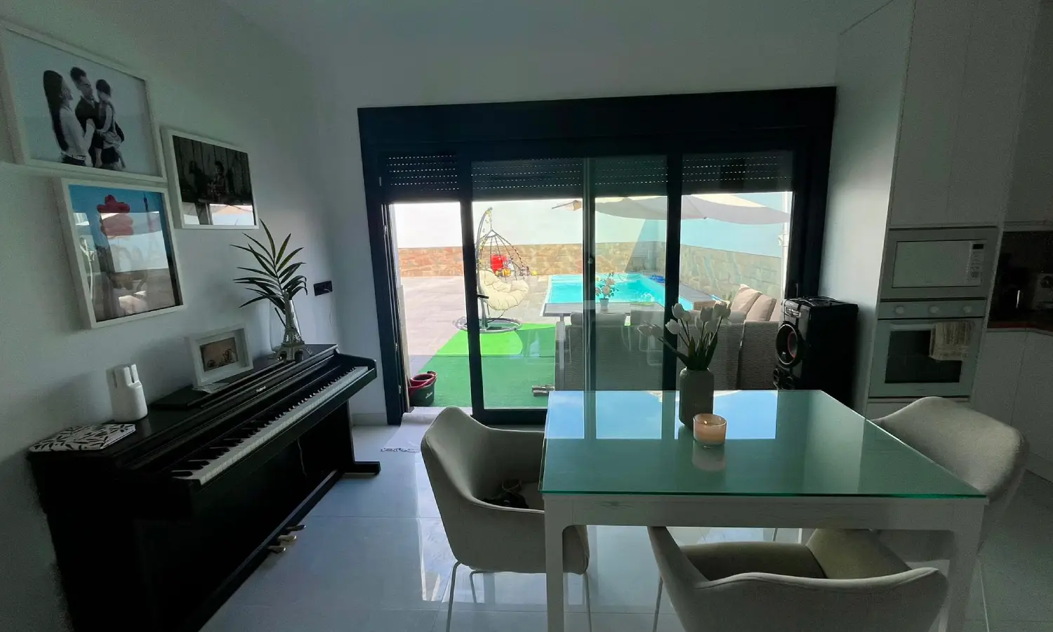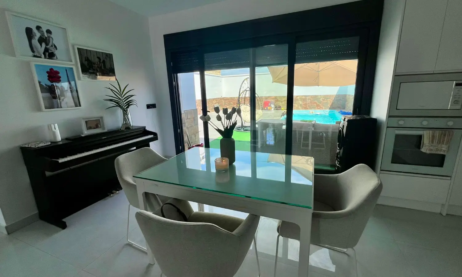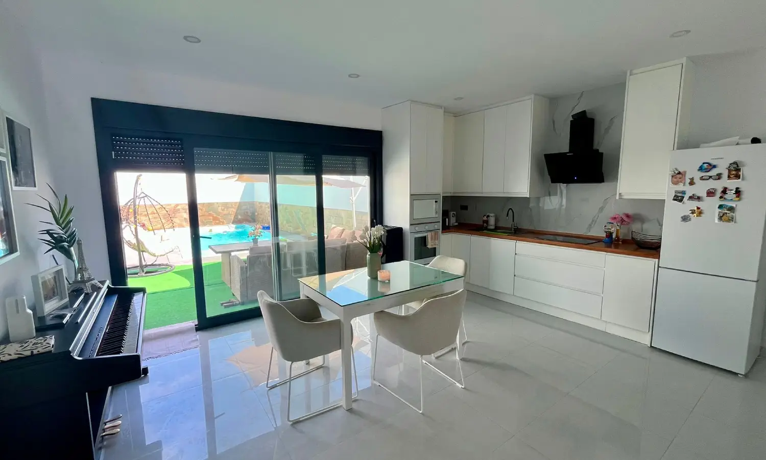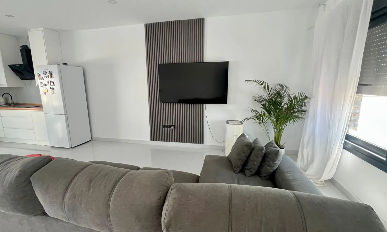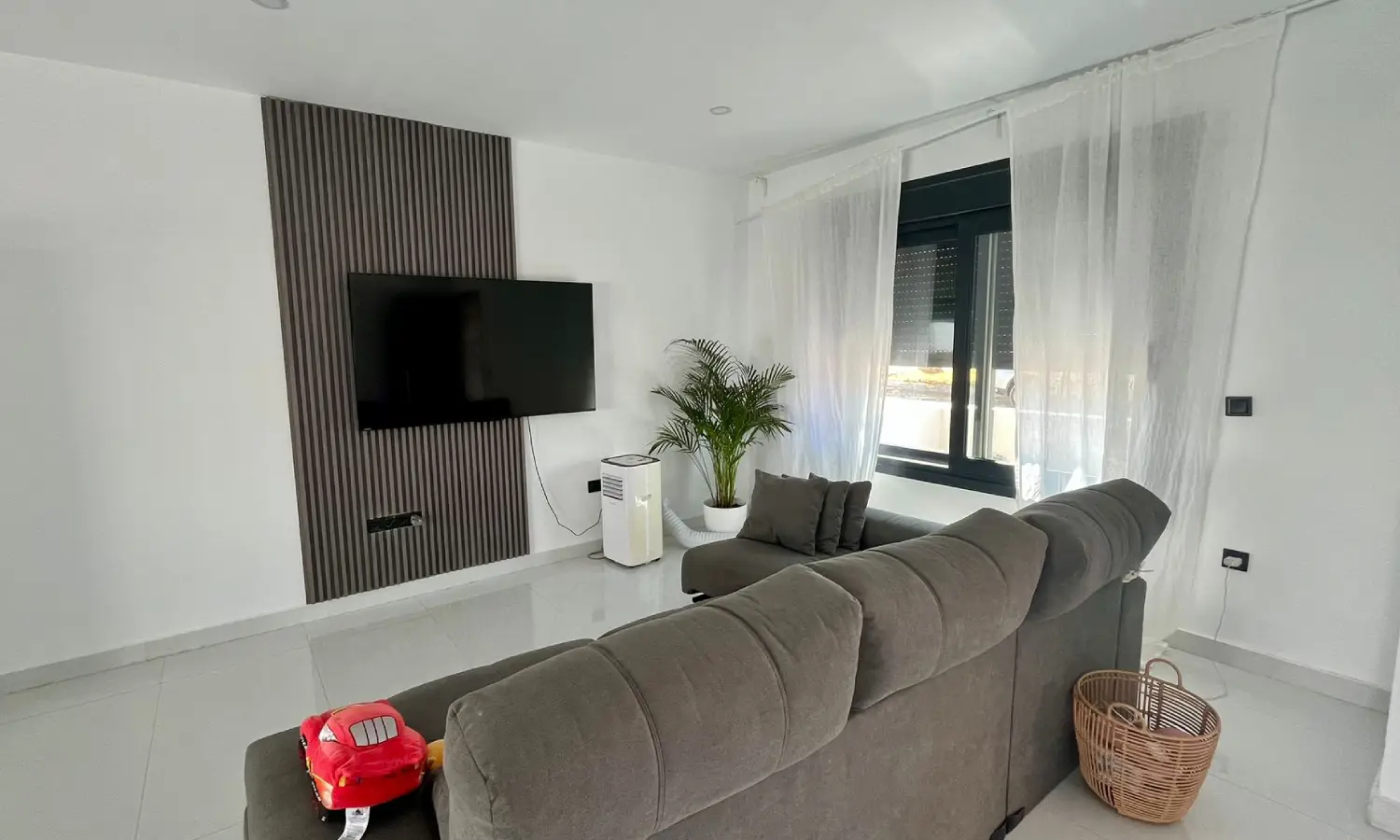 La vivienda cuenta con 100 m² construidos, donde un amplio salón comedor se ilumina a través de ventanas automáticas, creando un ambiente acogedor y moderno.