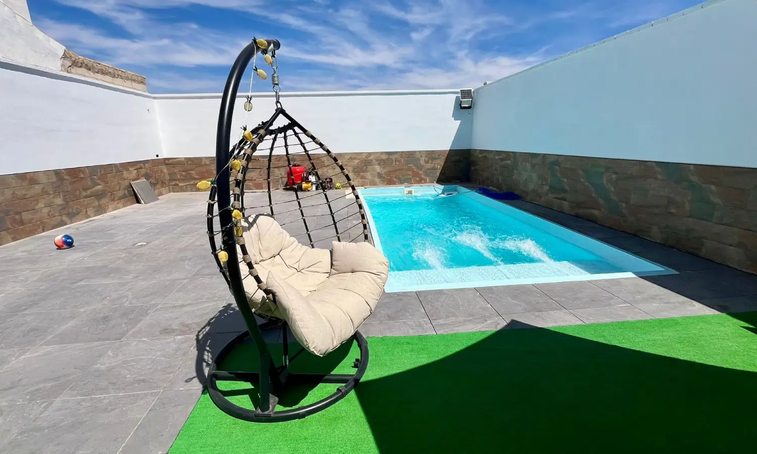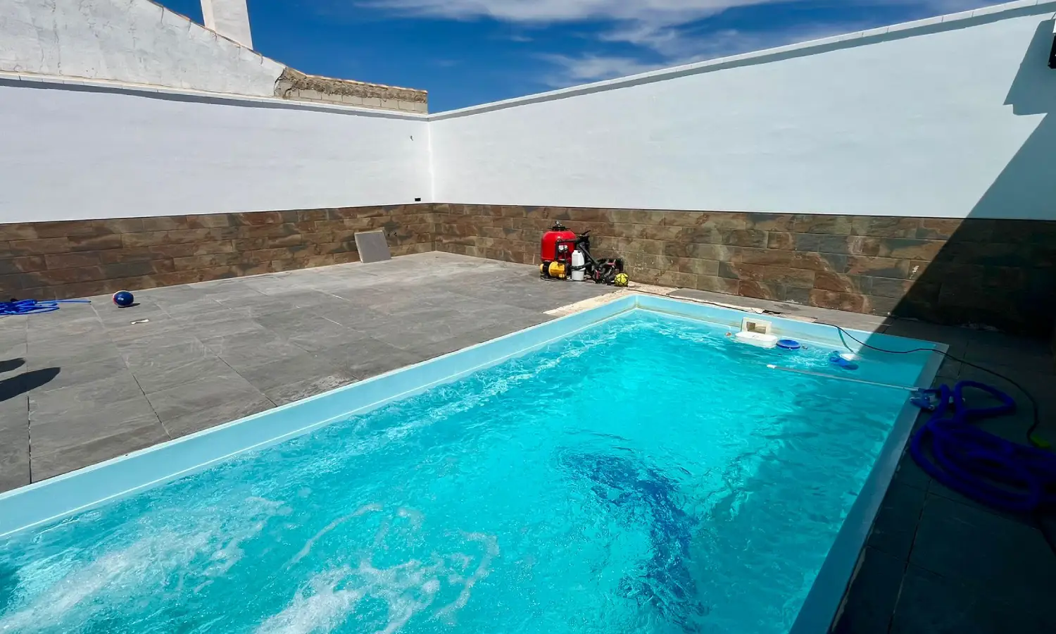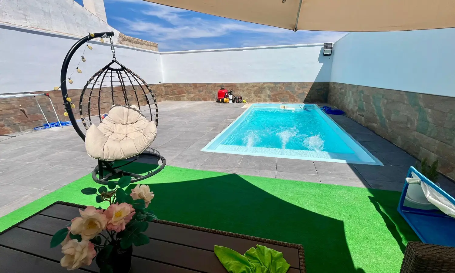 El exterior es simplemente impresionante: un patio de aproximadamente 100 m² alberga una piscina privada de 7 x 3,5 m², perfecta para disfrutar del sol andaluz.