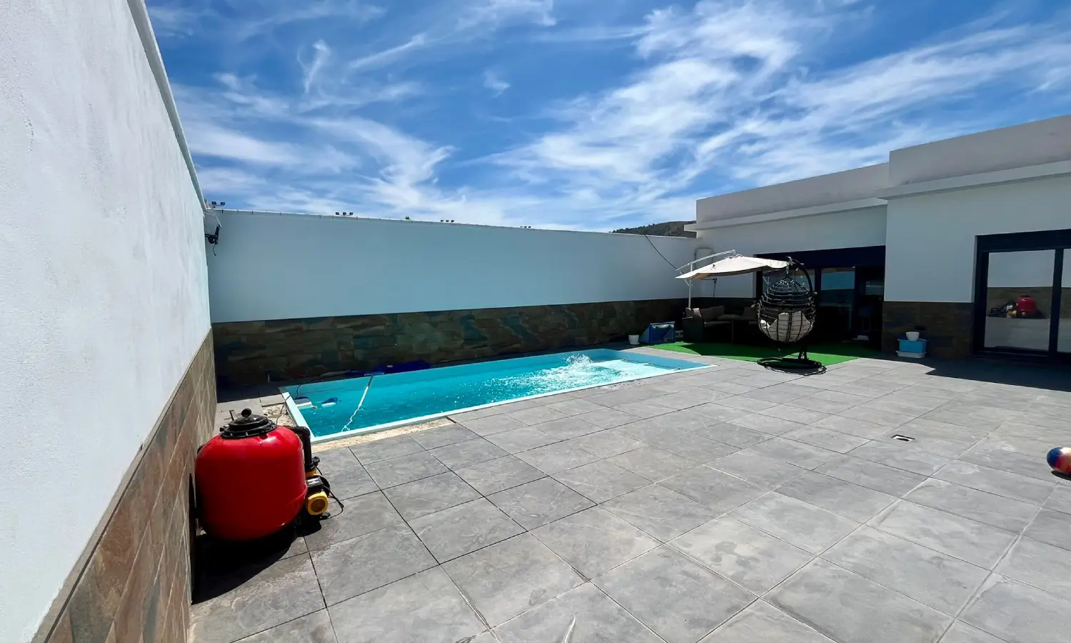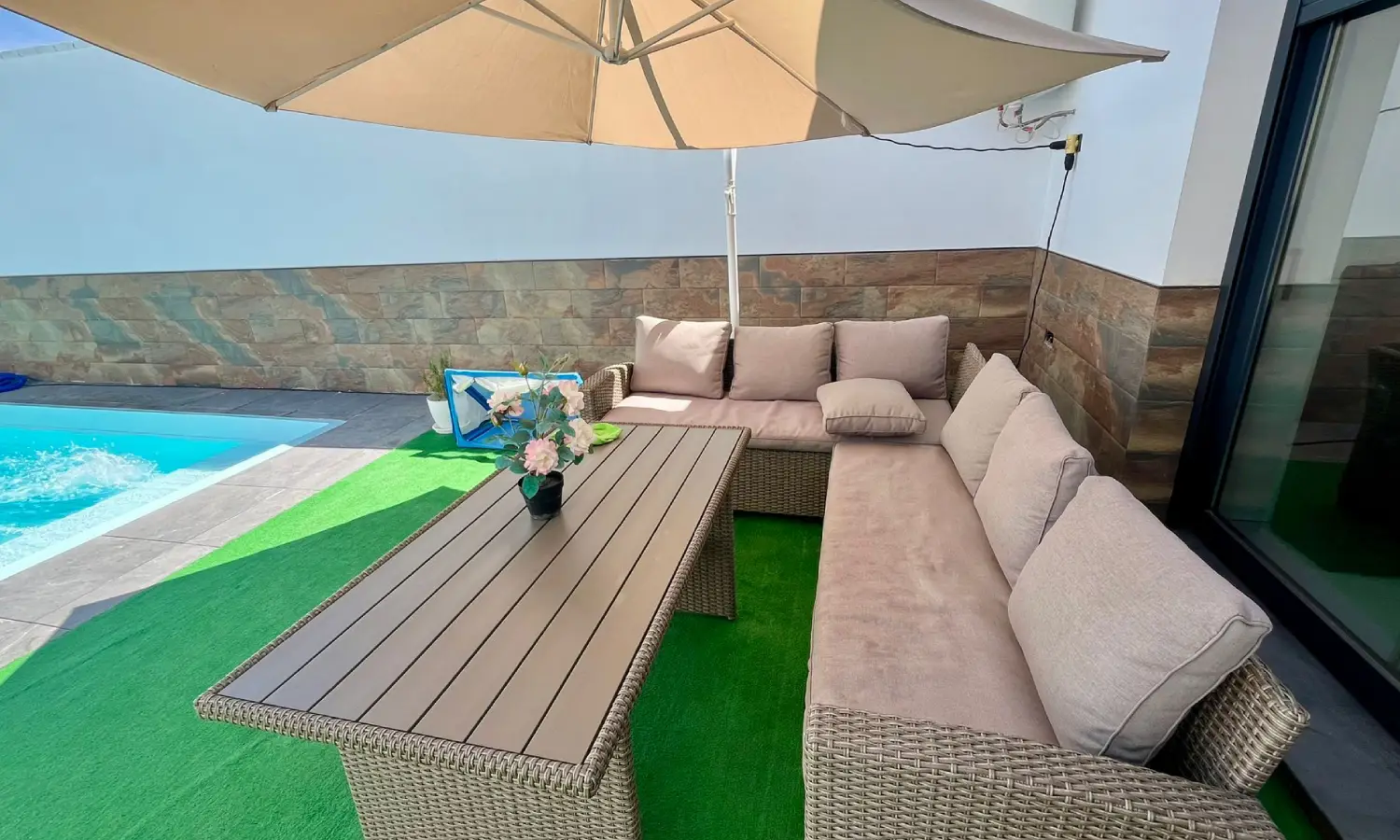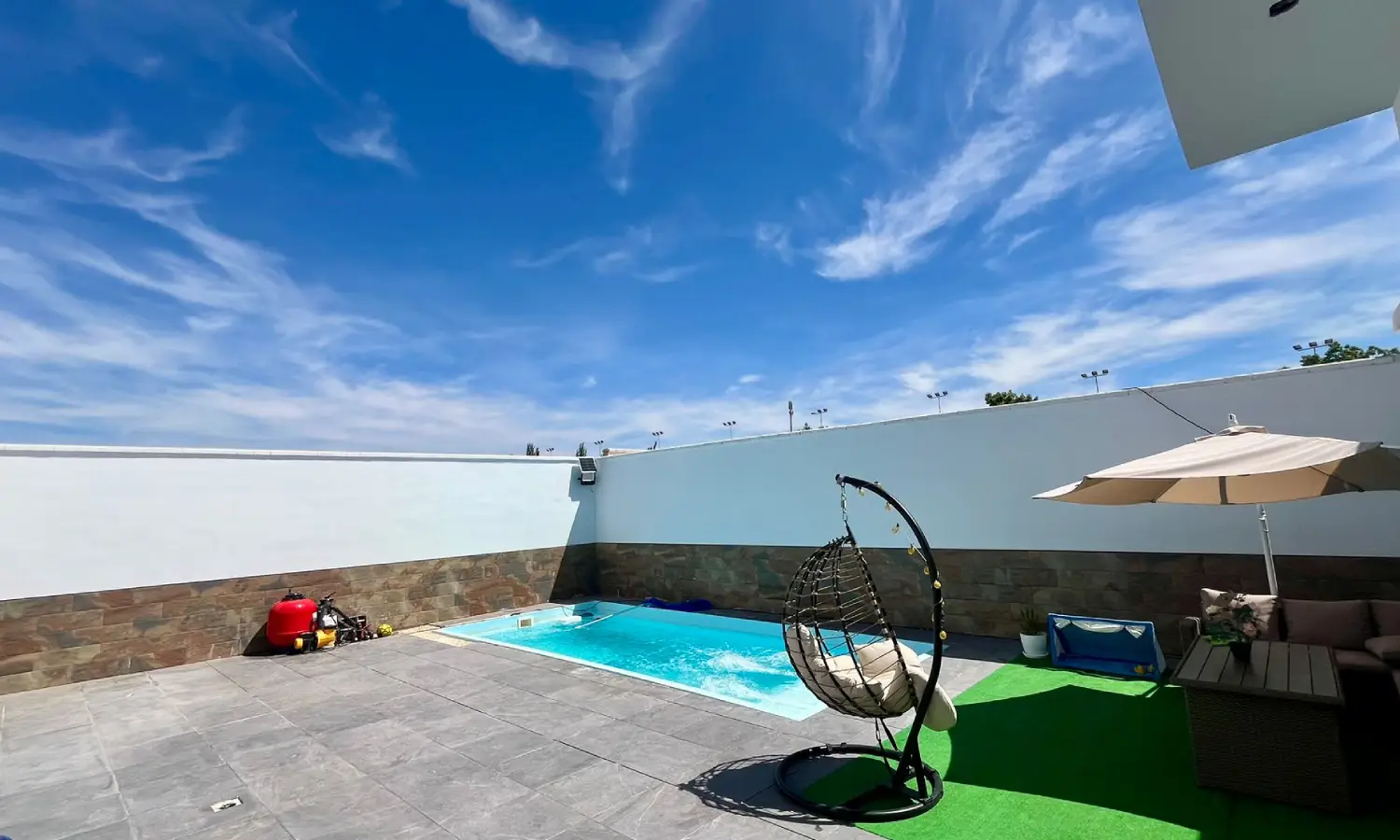 El exterior es simplemente impresionante: un patio de aproximadamente 100 m² alberga una piscina privada de 7 x 3,5 m², perfecta para disfrutar del sol andaluz.